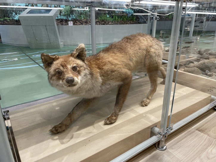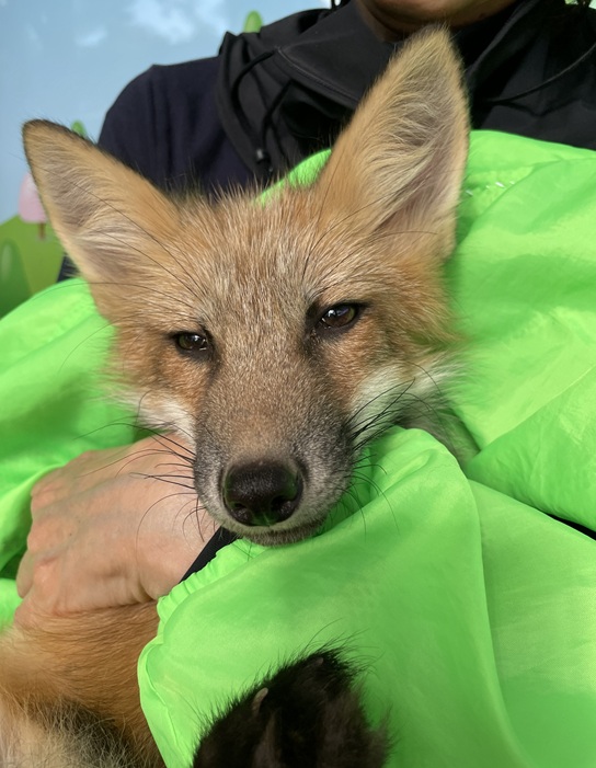 なお緑とオレンジの謎のウィンドブレーカーみたいなのを着せられていますが、これはキツネがおしっこしても弾けるようにする対策とのこと。結構前触れもなくおしっこするらしい。