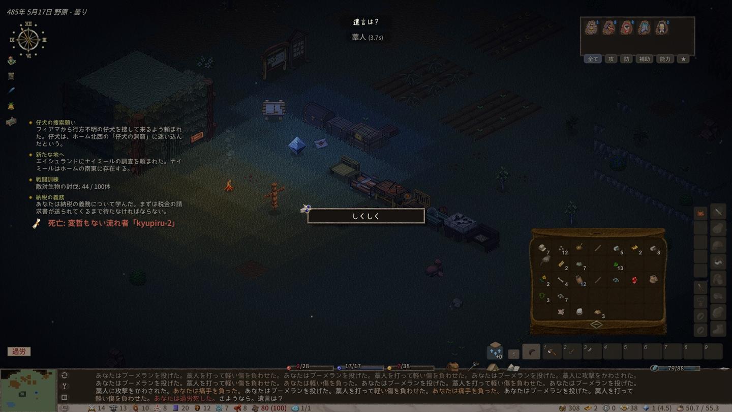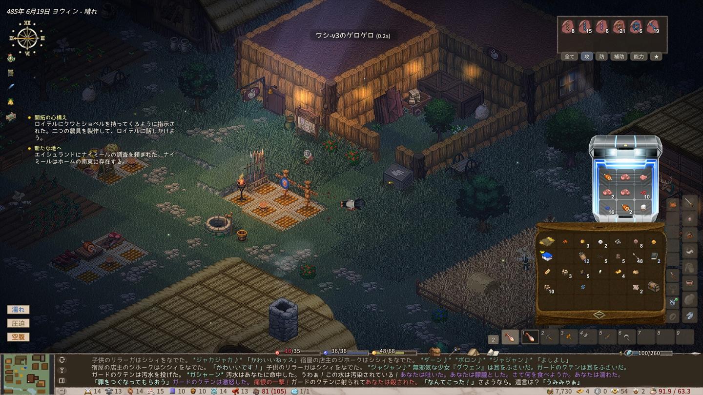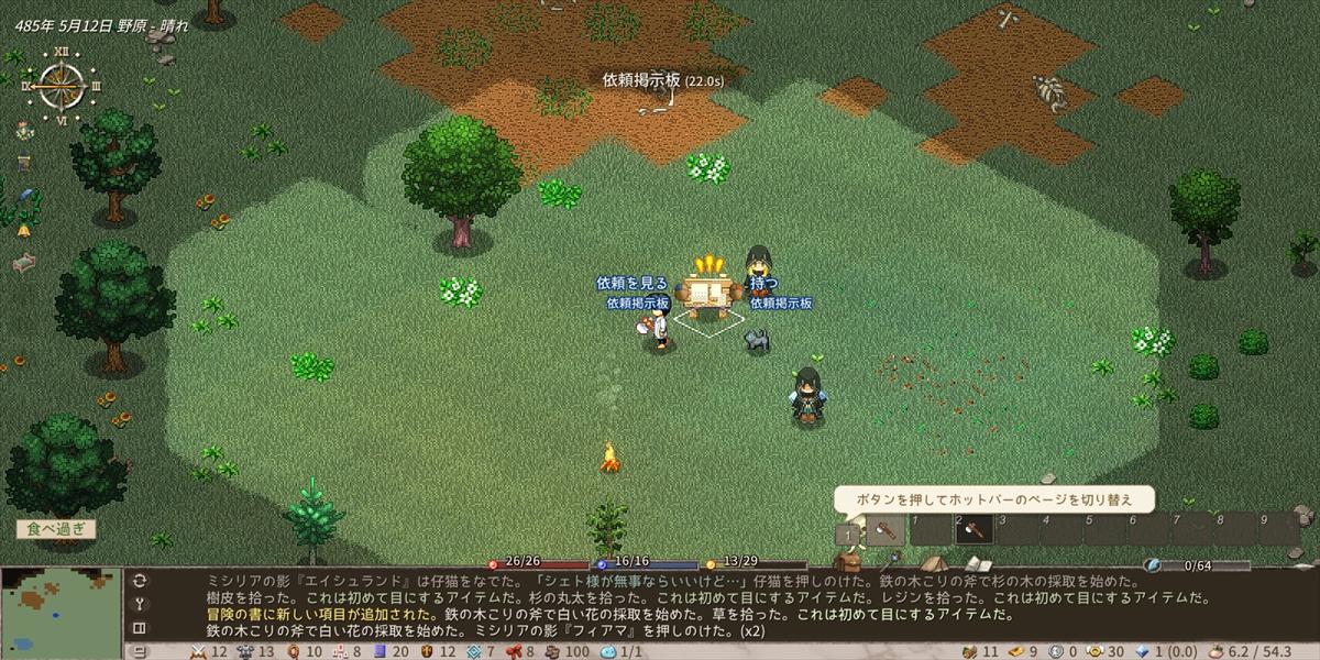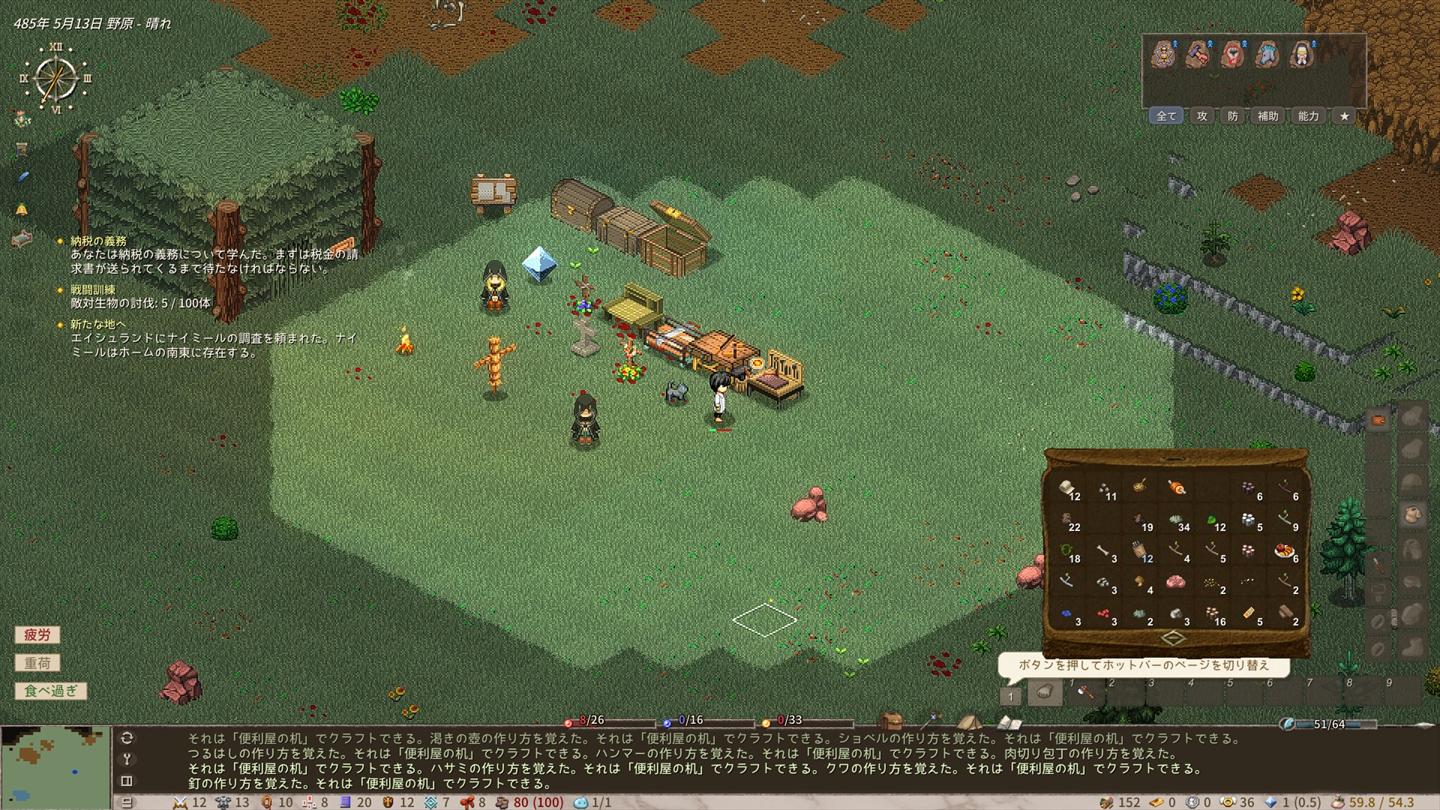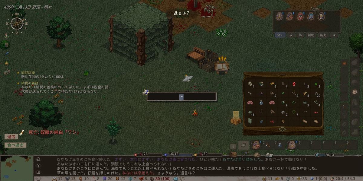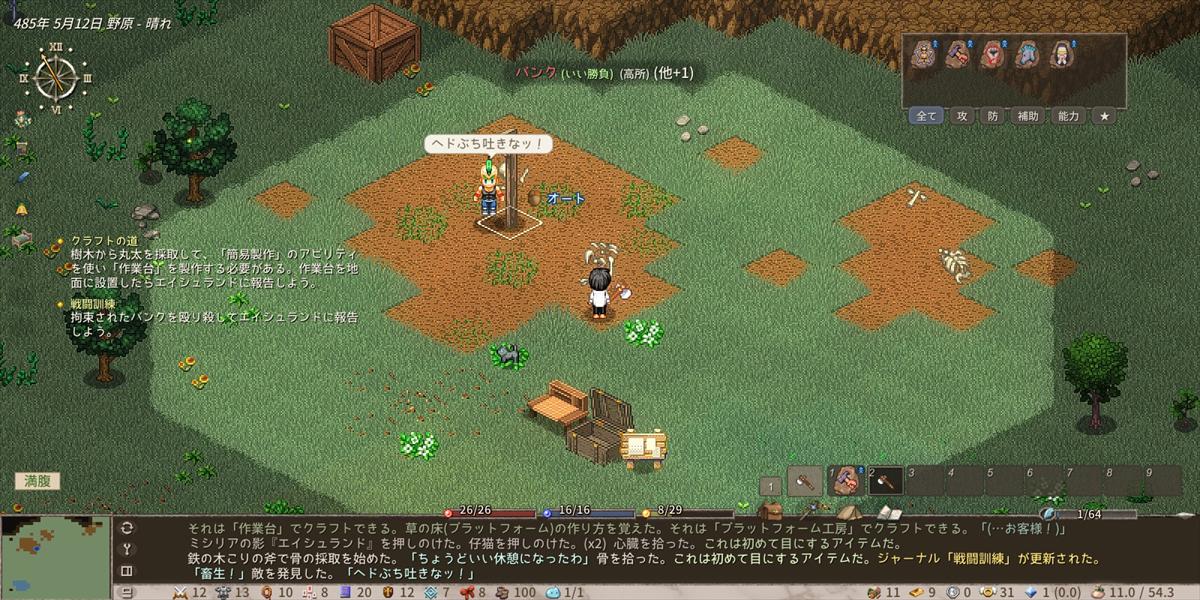 過労で何度もくたばりつつも、拠点を拡充させる方法については何となくレベルで理解しました。なお、あまりにも最初に作ったキャラがどうしようもなさすぎてキャラを一度作り直したのは秘密。