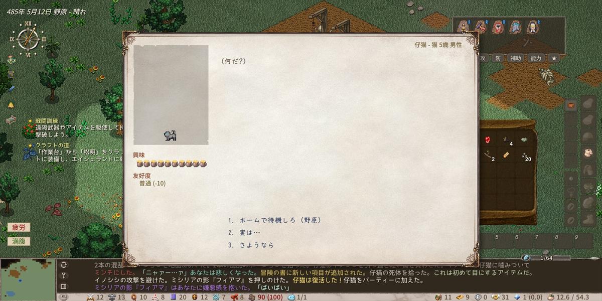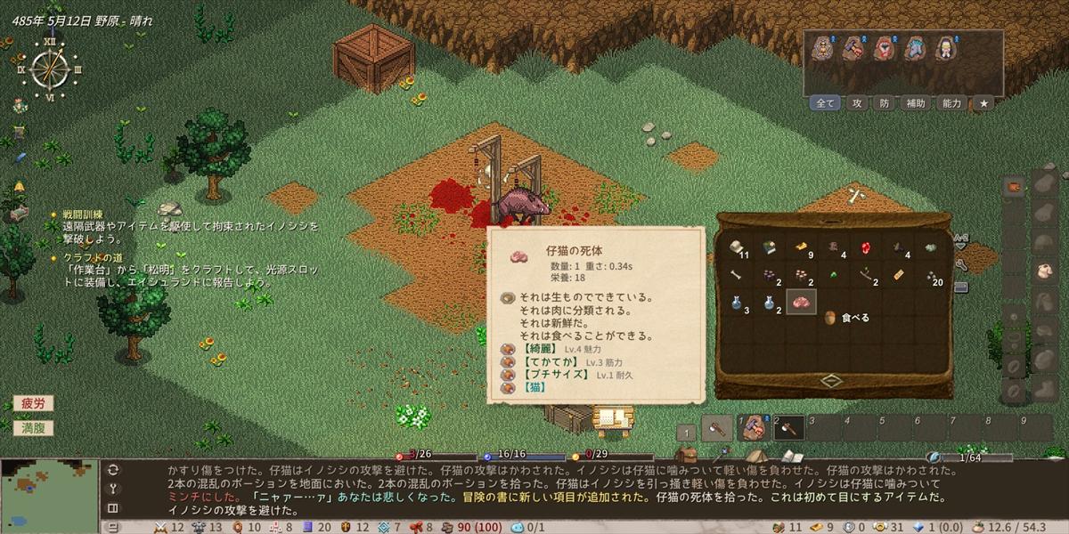 ログをみると子猫ことシシィさんを押しのけたら死んだかのように見えて草。実際はクラフトというか調理していたら死んだ。