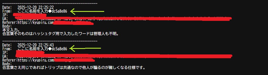 余談ですが旧メッセージ送信機能でも特定のIPアドレスからの送信を拒否するブラックリスト機能があるのですが、一度も機能しませんでした。一般家庭のプロパイダーじゃころころ変わる証拠ですね。
